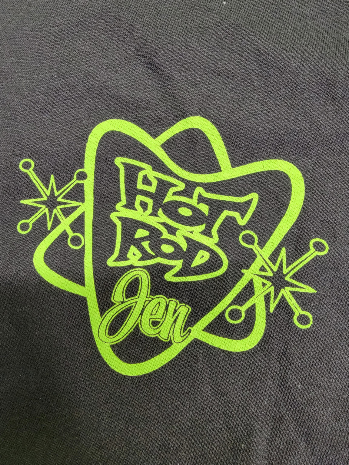 Front of shirt- small HotRod Jen logo where the tshirt pockets normally are.