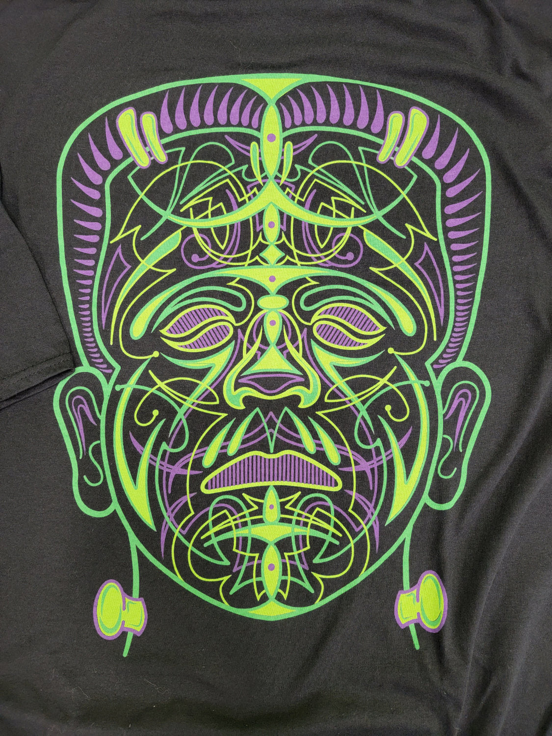 Frankenstein's Monster!!! I call him Frankie, this pinstriping design was created originally as a painting and now its printed on T-shirts for more people to enjoy.